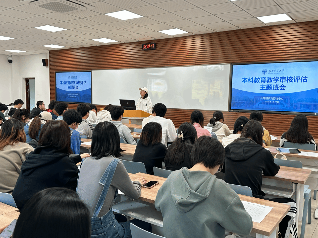 午夜av 将于今年参加教育部新一轮本科教育教学审核评估,为了帮助同学们深入了解新一轮审核评估相关知识以及午夜av 在学生学业投入、提升教育体验、提高支持服务、营造质量文化等方面的相关举措,2024年3月21日,午夜av 全体本科生在x1301开展本科教育教学审核评估主题班会,会议由辅导员李艳主持。