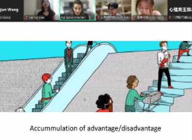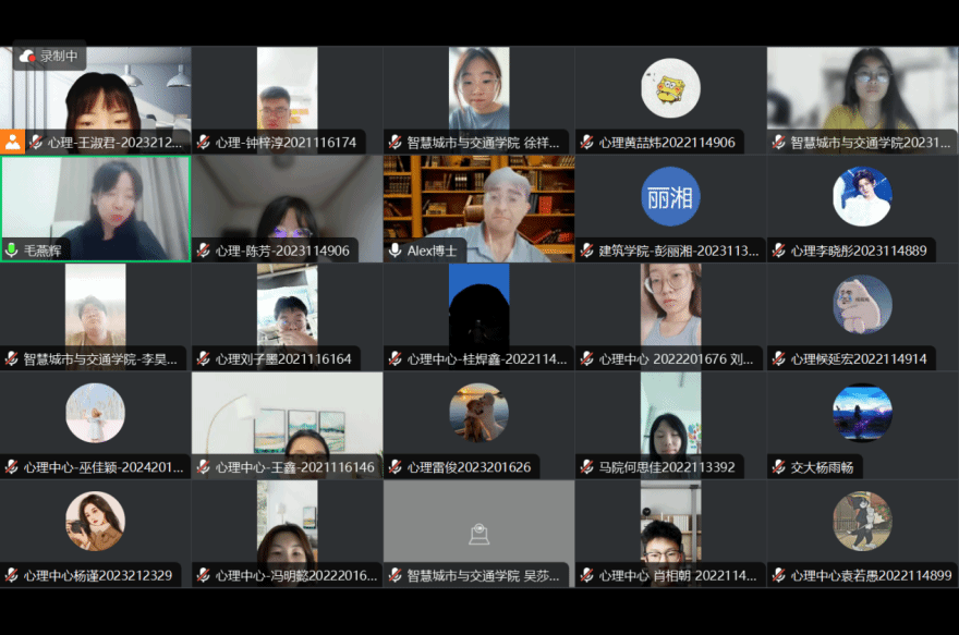 、智慧城市与交通、电气工程等学院的六十名本、硕学生通过腾讯会议参与了此次线上课程。English 教授从自我探索与身份认同切入,深入剖析了中国青年从大学到职场的成长路径。通过对 142 名上海大学毕业生的纵向研究,English 教授发现,家庭、社会关系以及个人职业规划在这一进程中发挥着关键作用。他指出,双亲不同角色的支持、与领导的良好关系对青年身份的平稳转变具有显著影响。