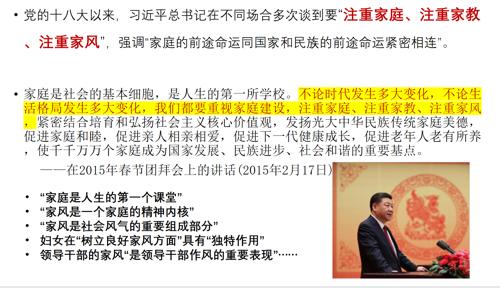 唐静老师从五个方面来讲解家庭文化建设。第一是家庭文化建设的时代意义;第二是家庭文化的内涵;第三是中国家庭文化的特征;第四是中国家庭教育文化;第五是家庭文化的构建。