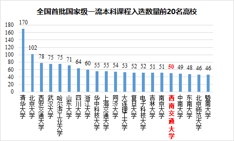 共50门课程入选国家级一流本科课程,入选总数位列全国第17位,是唯一一所入选总数达到50门课程的“一流学科”建设高校。这50门一流本科课程包括线上一流课程26门(全国并列第16位),虚拟仿真实验教学一流课程7门(全国并列第14位),线下一流课程10门(全国并列第23位),线上线下混合式一流课程5门(全国并列第23位),社会实践一流课程2门(全国并列第5位)。