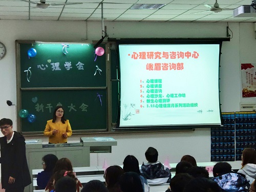 副主任兼峨眉咨询部主任王琛老师、峨眉咨询部副主任李玉梅老师和峨眉咨询部专职心理教师赵轶群老师外,还有心理学会全体新老成员。与此同时,也邀请到了峨眉校区其他各社团的干部代表参与此次心理学会的迎新大会。