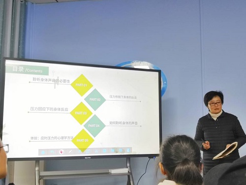 张平老师首先向同学们介绍了聆听身体声音的必要性。在长时间学习工作之余,身体和心理上不免都会受到压力的负面影响,如何去感知到自己身体对压力做出的反应,将有助于我们缓解压力,排解自己的负面情绪。