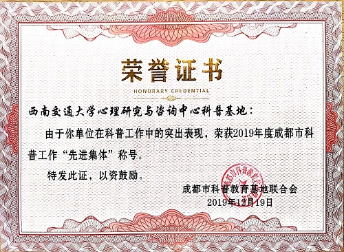 科普基地荣获2019年度成都市科普工作“先进集体”称号,唐静老师荣获“先进个人“称号。