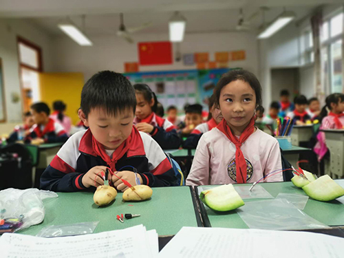 来自科普小分队的研究生志愿者林思勤、罗维惟给三年级的小朋友带来了趣味、生动的水果发电实验。首先,林老师通过生动的描述,引导孩子们进入了水果发电的世界。在了解水果发电原理后,小朋友们用自己的双手,将水果、电子表和铜片等材料组合到一起,并且尝试用多种不同的水果来发电。在实践中,同学们也了解了不同的水果发电产生的电能也是不一样的。