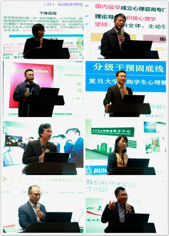 宁维卫教授、西安电子科技大学宋宝萍教授、贵州大学冉龙彪副处长和福建中医药大学丁闽江副主任分别以《以“三全育人”为契机,紧跟新时代,研判新问题,实现心理咨询服务高质量和多覆盖》、《多渠道全方位知识普及 培育学生积极心理品质》、《吉林大学开展《大学生心理健康》慕课建设的探索与实践》、《分级干预固底线 多方合力育英才——复旦大学建构学生心理健康五级预防干预工作体系》、《建构心理健康教育六级联动创新示范机制》、《加强队伍建设 助力学生健康成长——西安电子科技大学心理健康教育工作汇报》、《呵护心灵 播撒阳光——贵州大学扎实推进心理健康教育实践活动》和《中医药文化视域下的心理育人新机制》为题作了专题发言,为高校心理健康教育工作提供了不少可示范、可借鉴的经验。