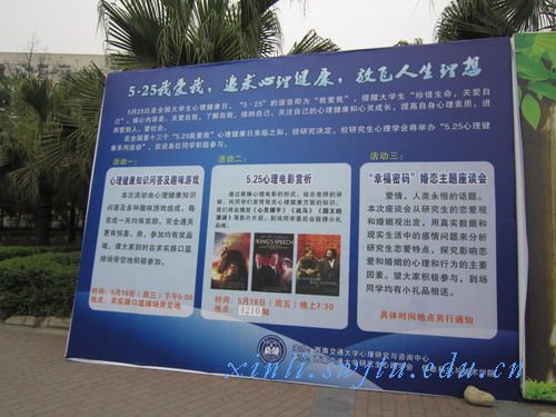 为迎接5.25全国大学生心理健康日的到来,让更多的人了解大学生心理健康日,关注心理健康,由午夜av 主办,研究生心理学会承办的心理健康游园活动于2012年5月16日下午在求实路口隆重举行。