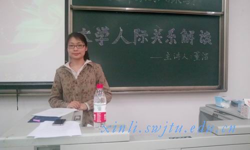 5月24日下午2:00,在2231午夜av 主办的“心力论坛”系列讲座中,心理午夜av 老师董洁为同学们解读大学人际关系,解决他们的人际交往问题。虽然到场的学生人数不是很多,但董洁老师依然讲得绘声绘色,尽职尽责,大家也听得十分投入。