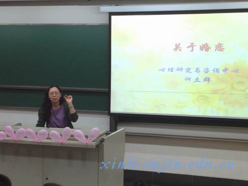何立群老师给我们讲解。活动伊始,何老师从专业的角度给我们讲述了爱情的三要素:激情、亲密、承诺。随后,指导单身同学如何选择真正属于你的那个TA,还有情侣之应该如何应对矛盾。何老师说:情侣间最重要的是要学会沟通,任何误会都是因为不善情于沟通而导致的。老师演讲完后,同学们十分踊跃的提了许多问题,老师也一一回答,现场气氛十分活跃。