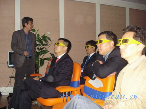 最后,专家组还参观了虚拟现实心理实验室。这是专门用于行为治疗的实验室,利用3D技术,虚拟画面,让测试者通过逼真的声像效果,直面自己惧怕的事物,进行心理训练和治疗。该实验可用于治疗恐高症、克服怕猫狗等动物的恐惧心理,舒缓地震恐慌心理等。该实验是大学生创新研究项目之一。专家们纷纷戴上3D眼镜,亲身体验这一独具特色的实验,并对午夜av