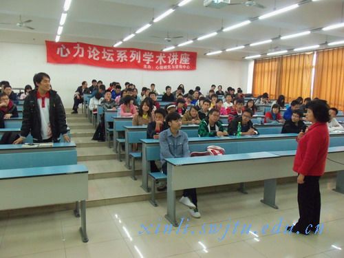 肖教授从“什么是压力、压力是如何形成、所导致的心理问题以及解决的办法”等方面为同学们进行了详细讲解。在讲座中肖旭教授以生动幽默的言语让我们明白释放压力不仅仅是靠调整自己的心态,也是需要外界配合。例如让自己的朋友有节奏的拍打自己的背部并说“大家需要你”等鼓励性话语。肖教授边说边请上一位同学替大家做起了示范。师生互动使现场的气氛很是活跃。