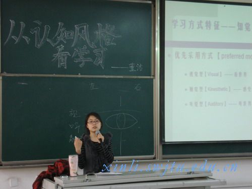 讲座从众所皆知的“磨针石”引入,激发了在座同学的兴趣。接着从传统文化看重“正确”而非“有效”导入,然后阐述“正确”和“有效”的含义,从而引出要明晰自身优势,采取有效的学习策略的主题。随后,董老师指出不同类型的人的认知偏好有所不同。人在总体上可分为视觉型、触觉型以及听觉型三种不同的类型,并深入浅出地介绍了人脑各系统的功能及肢体(如眼睛)活动与相应的心理活动之间的联系,同时又通过视频生动地验证分析了这一联系。就视觉型和听觉型的人,董老师还分别以达芬奇和爱因斯坦为例给出了相应的学习策略。在这过程中,董老师还以一个深受奥数折磨却转向走进音乐艺术而取得优异成绩的女孩的例子向我们阐述了这样一个道理:学习并不是别人怎样你就怎样,而应该要有自己的想法,走一条真正属于自己的道路。最后一段视频更是坚定了我们要勇于面对生活中的苦难,走出一条自己的道路的信念。