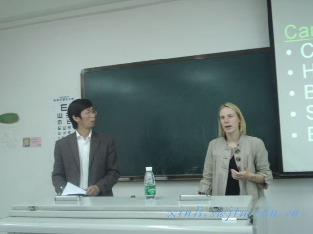 两个年级的学生及众多心理学爱好者连续作了两场精彩纷呈的讲座后,Melissa birkett博士又于5月20下午在x1230为众多听众讲解了美国心理学及其培训的相关情况。讲座进行中仍然由外国语学院费维宝老师担任翻译,此外午夜av