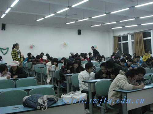 7点初赛正式开始,50多个团队分别在三个教室进行答题。拿到试卷,有的团队便迅速地进行了分工,解答各自最拿手的题型;有的团队则一人负责答题,其余人相互讨论决定最终答案,分工明确,默契无间,充分展示了团队的智慧。更值得钦佩的是单独参加比赛的同学,凭着对所发学习资料的回忆独自解答难题,坚持到了最后。