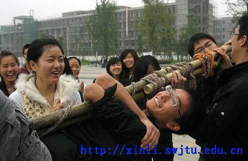 在热身活动“城堡攻防”结束后,全体成员便开始了第一项训练任务“渡河”。各小组利用两根3米长竹,五根2米短竹,2条20米长绳及10条2米短绳等道具,渡过一条6米长的设想小河。活动规则简单,但实际完成却颇费周折。多次尝试失败后,二、四两组仍是执着地单独行动,努力完善自己的设计;一、三两组则认识到单组作业在器材上的局限性,开始合作完成活动。约一个半小时候后,有少部分同学陆续渡过了“小河”。在与两位指导老师的交谈中记者了解到,单组行动实际上不能达到“渡河”目的。各组只有在认识到自身能力的局限性之后,通过与他组合作,才能到达“理想的彼岸”,实现双赢。张老师还谈到,该项活动有利于同学提高自我认识,了解自身在集体中扮演的角色。