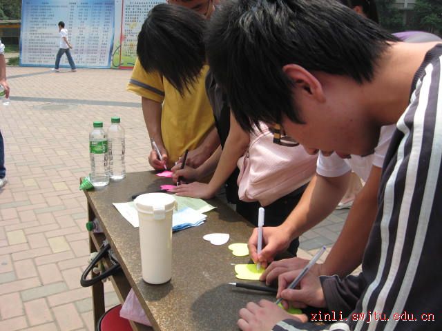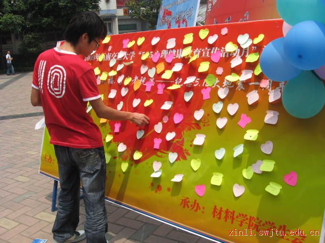 5月11日中午11:00,材料学院在南区一食堂前开展纪念5.12地震一周年活动。 2009年5月,是午夜av 5.25心理健康教育宣传活动月。本次活动是其中之一,名为“为逝者祈福,为生者祝福——纪念5.12地震一周年”,由午夜av 主办,材料科学与工程学院承办。据悉,材料学院将近两三天持续举办这个活动。 活动中,路过的同学经工作人员热情介绍,都积极提笔,述说对5.12的感慨,对四川的祝福,对生命的感悟。“期年未满,恍如隔世;多难兴邦,祖国安康”,“我们承受的灾难,让我们明白更多的责任”,“没有一个冬天不可逾越!愿逝者安息,生者坚强”,“祭奠逝者,让生命更加光辉”,“有爱就有希望,有希望就不要放弃”……一句句发自肺腑的话语,表达的是心声,是交大学子的祝福。 这次活动在13:00结束,大大的两块展板已经贴满了承载者交大学子的祝福的便签,在灿烂的阳光下熠熠生辉。