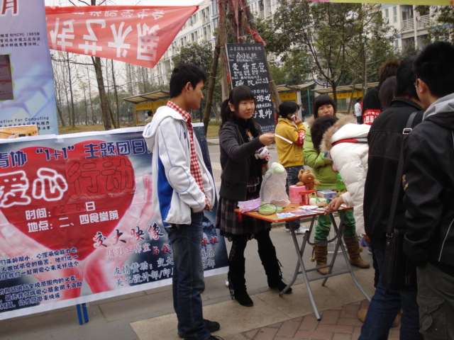 自11月2日至6日,08级材料6班和成型1班在二,四食堂门口开展了由材料学院青协主办的“爱心义卖”活动。虽然天气很冷,但活动现场流动着的暖暖温情感动了每个人。 据悉,本次义卖所有待售物品全部由同学募捐而来,义卖所得将全部捐给成都市儿童福利院,用于改善院里儿童的生活,尽管这次义卖筹集的钱对于那些儿童长期的生活开销来说只是杯水车薪,但却充分体现了午夜av 学子对社会弱势群体的关怀与爱心。活动过程中,桌子上和地上摆的琳琅满目的物品吸引大批同学围了上来,组织人员积极主动,热心地对前来询问的同学进行回答。待售物品的价格是购买者根据自己的认知定的,因此双方都对这笔交易很满意,一时间现场气氛热烈而融洽。当被问到为什么不去商店买这些东西时,很多同学回答说是想为社会做些事情,为那些儿童送去自己的一份爱心。这着实让人感动和敬佩。 目前,此次活动已筹集将近1000元,这笔钱有着沉甸甸的分量,它代表着现今大学生的良好风貌及社会道德,传递着人间的温情与爱心。