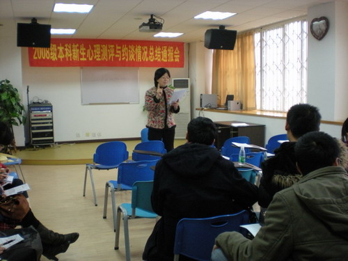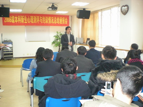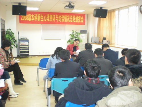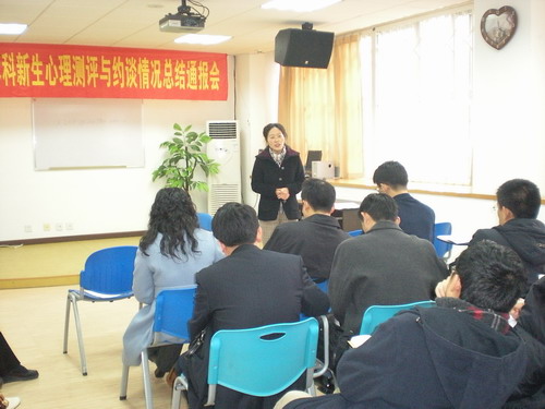 咨询室主任马淑琴老师通报新生约谈的情况。马老师说,在约谈中我们发现学生主要存在以下一些问题1.环境不适应。来到新环境,有新的要求,不适应;2.强烈的失落感,许多新生在学生会和协会招新的时候没有被选上,有太强的失落感,自尊心受到损伤;3.学习问题。很想学习,但学不得法,没有从高中的学习模式中转变出来,从而担心挂科;4.孤独感。中学时成绩好受关注,不需要太多努力就搞好人际关系,而大学不是这样的,以至于没有好朋友,孤独;5专业不满意。.专业可能是调配来的或者是父母让填的,对专业不感兴趣,学习没有动力。所以各院系应尽可能开展形式多样的、有针对性活动,帮助新生度过这一段心理断乳期。马老师还介绍了一些案例以及工作中的心得体会,供老师们借鉴。