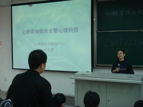 及创学指导老师何立群为大家带来题为“心理咨询师的心理特质”的精彩讲座。还没开场,容纳170人的大教室已经坐的满满当当。心理学会会员、各班心理委员以及心理学爱好者们早早来到教室等待何老师。