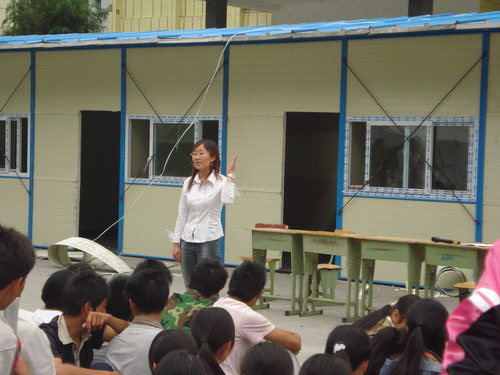 活动开始前,同学们整齐得排成了列队形式,赵老师一句幽默的话语“我不是法西斯,不是来对你们实行军事化管理的”,把现场气氛调动得活跃了起来,她让同学们打破方阵形式,就地取材,席地而坐。首先,赵老师提出一个问题,示意自认为有心理问题的同学举手,结果只有一个女生举手示意,惹得同学们哈哈大笑。赵老师紧接着很认真得说,“我们都是处于亚健康的人,包括我在内”。 话一出口,同学们面面相觑,都很诧异,赵老师抛砖引玉, 通过一个小小的热身游戏,让大家认识到最近以来出现的担心恐慌、情绪紧张、觉得自己很渺小、容易生气和激动、提不起精神学习、性格变得敏感起来、身心疲惫、容易顶撞老师、记忆力减退、注意力不集中等情绪反应和行为表现都是地震综合症和考试焦虑的表现方面,而且是存在于大家中的普遍现象。针对这些问题,赵老师给大家提出了一些心理调试的方法,如积极的自我暗示、学会倾诉、学会求助、学会感恩、学会珍惜等。