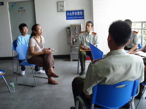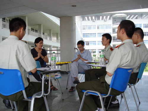 接下来所有的同学们被分成六组,分别由一位辅导老师带领进行小团体心理辅导活动。5·12地震事发突然、造成的灾难大,不可避免地会对涉及地震的许多人包括抗震救灾人员造成不同程度的心理和身体影响,会造成人体的应激反应,带来消极情绪、思维混乱、行为失控等反应。首先,为了科学地评估地震对被辅导者造成的身体和心理影响,老师们为同学们分发了《地震后不同人群心理状况基线调查表》,指导其认真填写完毕后,心理辅导老师用九分格法指导国防生分享抗震救灾经历和感受。所谓的九分格法,即要求队员在一张A6纸上自行把纸分为九格,然后分别在格子里用一幅图画来表现自己在地震后及救灾中的经历和感受。很多平时很少绘画的同学在拿到纸笔后面有难色,无从下笔。但半小时过去后,每个同学还是完成了自己的作品。接下来是口述分享时间,每个国防生分别发言分享自己的抗震救灾经历和感受。尽管5·12地震已经过去一个半月了,但国防生的叙述还是让救灾现场历历在目,动情处无不哽咽失语。许多国防生觉得自己做的不够,希望在毕业后为灾区做更多贡献。在有些沉重的经历分享后,心理辅导老师们引导同学们做基于中国的静脉理论的“八点法”,目的在于治疗创伤,放松情绪。许多同学们在做完放松式的“八点法”之后感觉良好,轻松了不少。