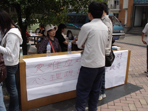 的老师们在犀浦校区的一食堂与三食堂之间和九里校区求实路路口为同学们进行了以“灾难应对,心理疏导”为主题的现场咨询活动。