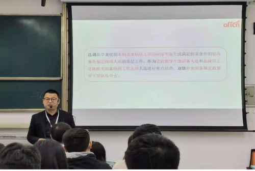 本次活动围绕国家公职考试展开。活动中,黎老师分别就2021年四川公职考试种类和考情;2021届、2022届毕业生备考规划;公职考试的主要题型及解答思路三方面进行讲解。其中,黎老师重点对公务员、选调生、事业单位、军队文职的发展待遇、报考条件、考试内容、备考方向分别进行讲解,要求同学们以严谨的态度和不懈的努力备考国家公职考试。活动过程中,黎老师还引用真实案例向同学们说明公职考试的不易。最后,在答疑环节结束后,黎老师借用“黄沙百战穿金甲,不破楼兰终不还”祝同学们在公职考试中马到成功!
