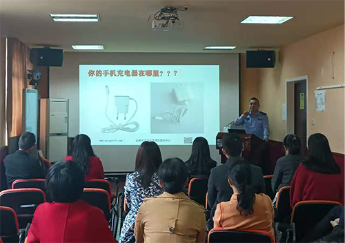 教师展示了防范火灾的重要性。他提到,秋冬季节为火灾多发季节,大家要注意家庭及办公场所用电安全,并提到了在日常生活中被大家忽视的几种电器隐患,如手机、电脑在充电后应将插座拔掉,避免危险发生。他强调,要注意家用电器的使用年限,到达使用年限的电器应及时更换,否则电器可能会因短路而引起火灾。