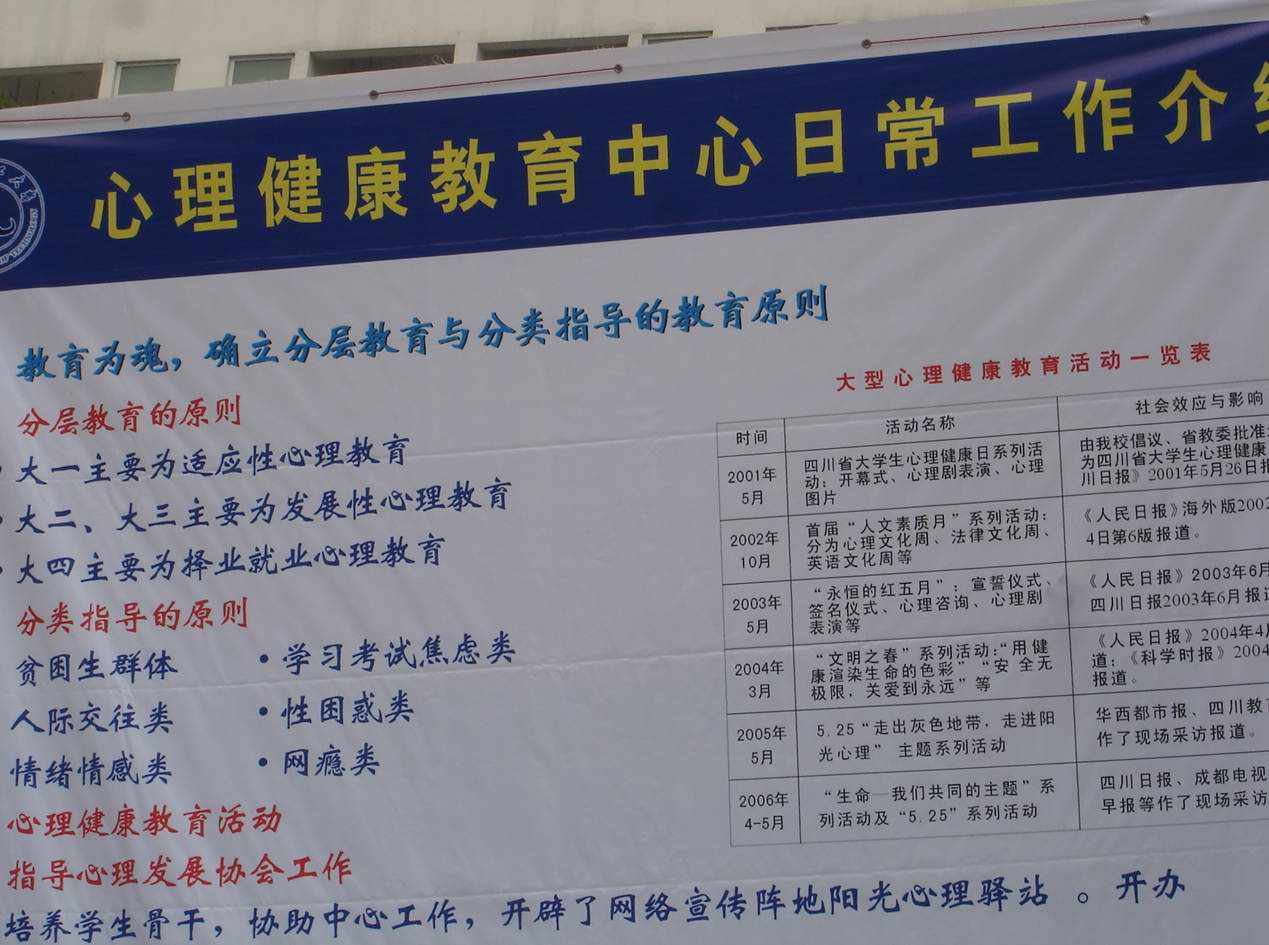 举办的2007年四川省高校“5·25大学生心理健康教育宣传周”启动仪式。她说:这个活动本身就意义非凡,加上交大老师和同学们的精心策划与安排,整个活动有条不紊,内容丰富而具有教育意义。在这里,各高校互相交流、互相学习、取长补短,同时也增进了同学间友谊,帮助他们共同进步,快乐成长!