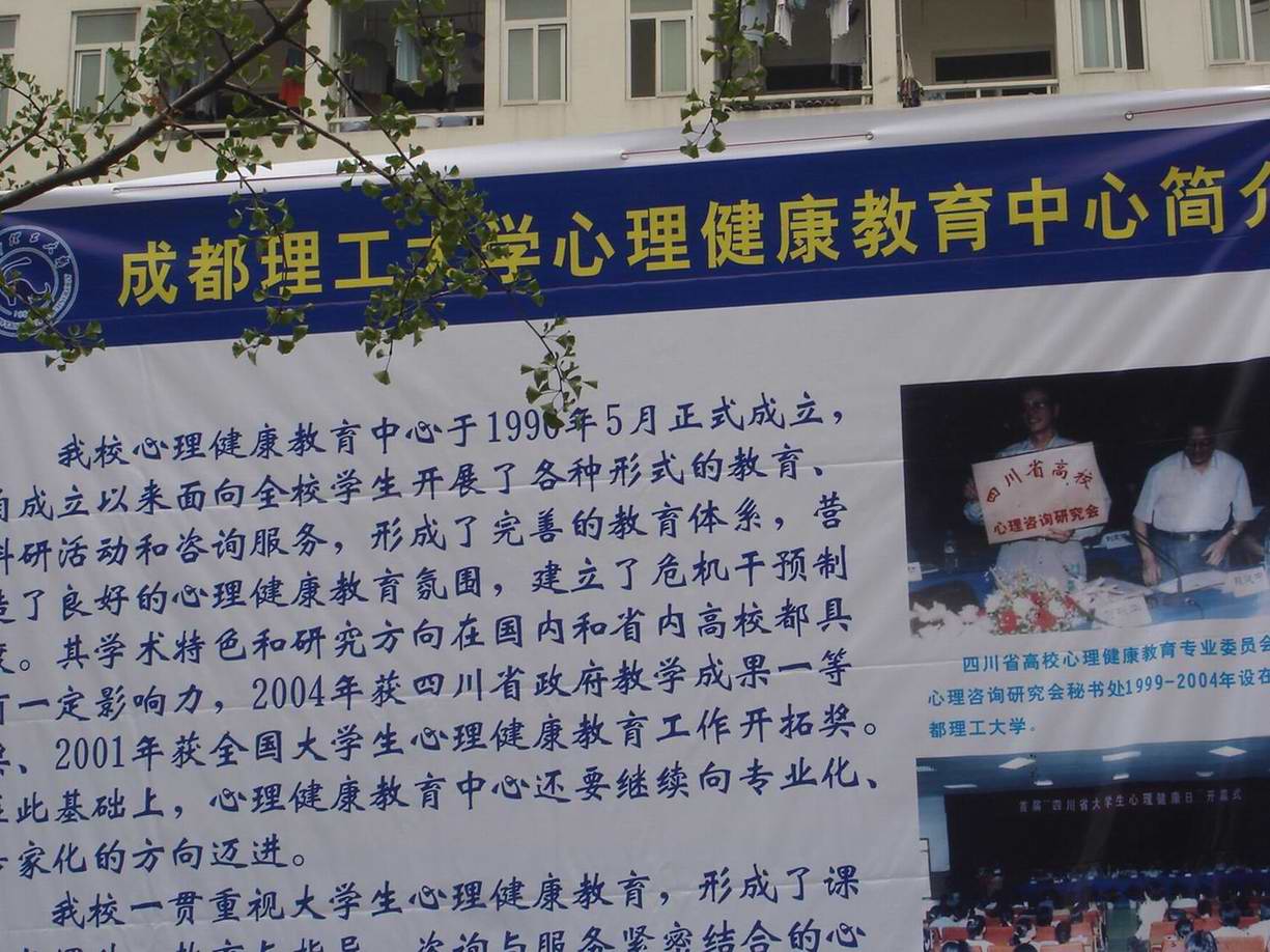 迎来了来自省教育厅和12所高校的领导、心理健康教育专家、老师和学生代表们。众多领导、师生们齐聚一堂,在我新校区校一食堂三楼多功能厅举行了2007四川高校“5·25大学生心理健康教育宣传周”的启动仪式,拉开了大学生心理健康教育系列活动的序幕。成都理工大学的富有特色的系列活动更是引起了我们的兴趣。为此,记者采访了成都理工大学的指导老师朱晓珊老师和学生代表。