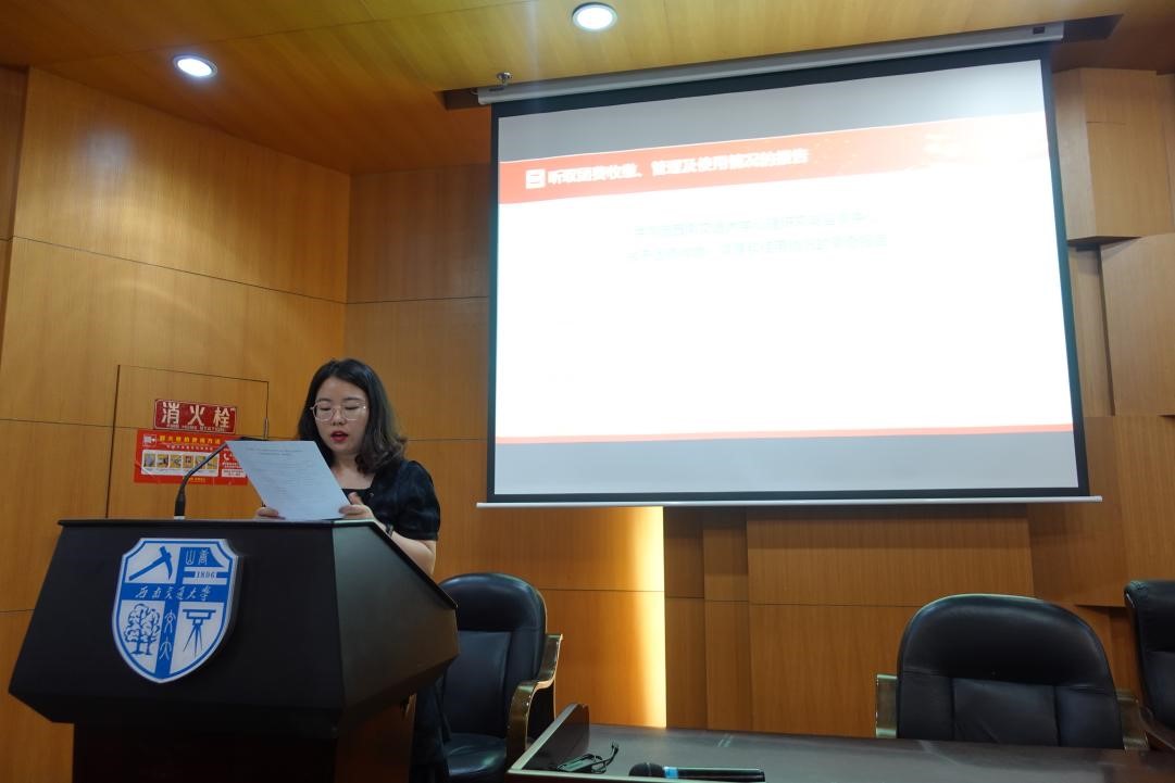 首先,樊菊老师向在座代表汇报了此次大会的筹备工作情况,详细介绍了前期的大会筹备工作、大会工作报告起草工作、团学代表产生、团学代会议程及组织准备工作,并代表本次大会的筹备工作领导小组对工作人员和代表们的支持与配合表达了感谢。