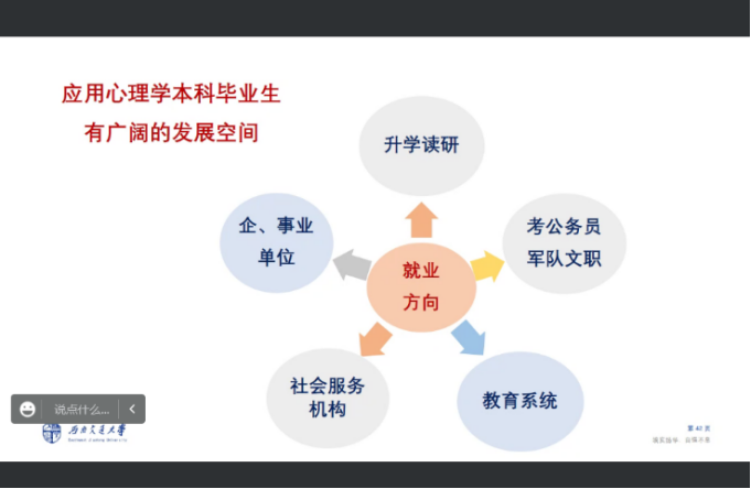 应用心理学培养的两大特色,即心理学与健康学相结合与心理学与交通工程结合。最后,柯书记就学生和家长最为关心的就业问题进行了交流,明确表示社会对应用心理学人才的需求日益增加,同时简要介绍了应用心理学人才的五大就业方向。