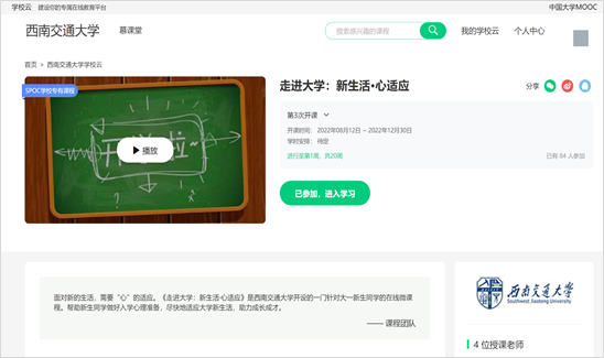 、教务处特意为新生送上“走进大学:新生活·心适应”微课程,该课程已经在8月12日全部上线。这门系列微课主要是给新同学提出一些切实的建议和可操作的方法,助力新同学更快地了解大学、认识自己,以尽快适应大学新生活。