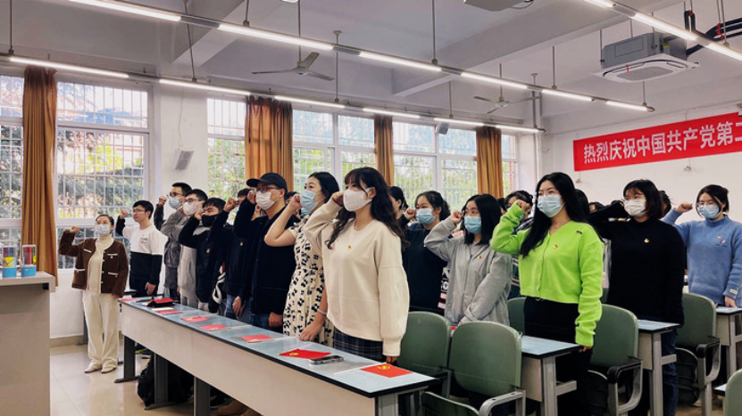 辅导员樊菊老师领誓重温了入党誓词。同学们以立正姿势站好,庄严肃穆的举起握拳的右手,清澈的目光注视着党旗,嘹亮的誓言声回荡在会场。宣誓完毕,同学们激动的心情久久不能平静,手中挥舞着党旗等待党的二十大开幕式的到来。当国歌响起时,全体人员起立合唱国歌,歌声慷慨激昂,饱含同学们的赤诚之心。