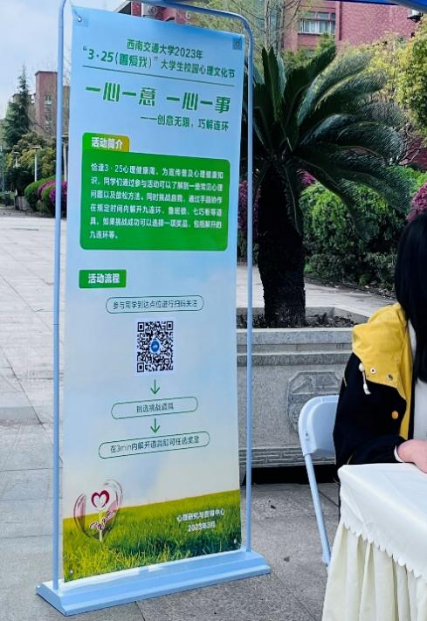“3·25善爱我”心理文化节系列活动,于2023年3月23号下午,在犀浦校区南门小广场和九里校区图书馆门口,同步开展了“创意无限,巧解连环”活动。通过在规定时间解开九连环、鲁班锁、七巧板等道具,让同学们手脑协作,发挥创造力,在解题的过程中宣传普及心理文化知识,帮助同学了解一些常见心理问题及放松方法。