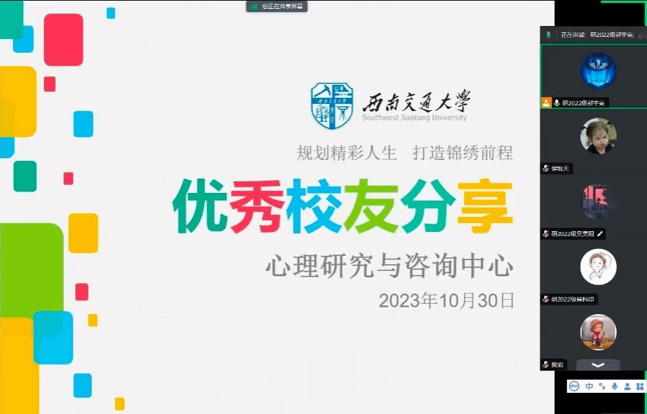 于2023年10月30日通过腾讯会议开展了“薪火接力,‘职’面未来”——优秀校友经验分享会。会议由郭宇亮等同学组织,辅导员樊菊老师主持,心理午夜av