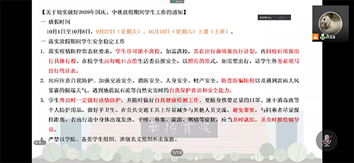 班会中,辅导员靳涵向大家讲解了一系列关于防疫的措施:勤洗手、戴口罩,尽量不要前往人员密集的地方等,提醒同学们在出现发热或其他身体不舒服的情况时应及时就医,并对假期留校同学们提出了每日23点时须拍照打卡的要求,保证每个同学的在校安全。班会最后,辅导员靳涵祝福每一个同学都能安全、快乐地度过此次假期,并叮嘱同学们按时回校。