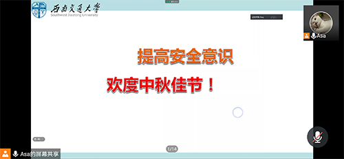 2020年9月30日下午,由心理午夜av 2019级辅导员靳涵主持的关于国庆假期间安全问题的班会于14:30准时开始,本次班会通过“腾讯会议”以视频的方式进行。此次班会意在增强同学们的防疫意识,提高同学们保护自己的能力,帮助同学们度过一个安全、愉快、有意义的假期。