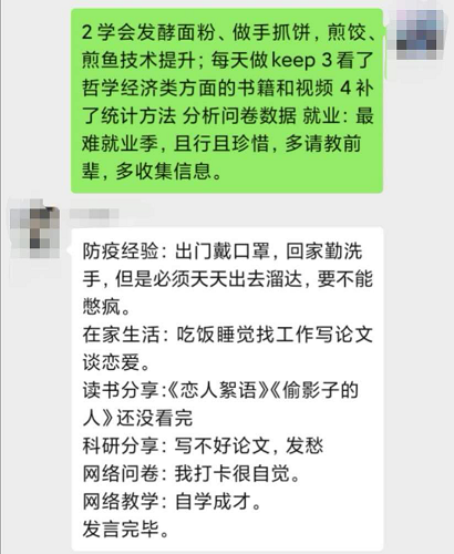 活动中,大家踊跃发言,通过在线语音就疫情期间的心路历程、防疫经验、日常生活、读书心得等进行了分享。不少同学通过在家阅读、自学等方式充实自己,大家都积极推荐自己阅读的书目,如《月亮与六便士》、《乌合之众》、《追寻生命的意义》等等,并就书籍内容发表了心得体会;研究生们也对学术课题进行了交流,其中2019级研究生针对心理咨询展开了激烈讨论,包括咨询的具体技术、运用范围以及在模拟咨询中遇到的困惑等,同学们都认为学习小组的形式帮助自己建立了更合理高效的学习习惯,通过组员之间的相互督促和互相帮助,使得学习不再枯燥,也进一步增强了宅在家情况下的人际互动。2018级本科生韩雨桐还为大家科普了预防疫情的几点办法,内容包括口罩的佩戴,消毒与外出的注意事项;2017级的同学们分享了烹饪、绘画、健身、摄影等新技能,并将成果以图片的形式展示给了大家;2019级的本科新生也度过了有意义的寒假,并且对网课的平台使用做好了提前准备。这些有趣的分享、亲切的交流帮助同学们缓解了紧张、压抑、焦虑等情绪。