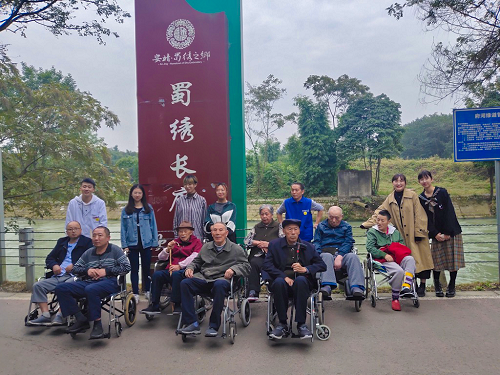 325社工小组主要是以关爱老人为主题,来开展活动。2019年10月6日325小队参与了青青小屋的重阳节活动,给老人们讲故事、表演节目,和老人们做游戏,最后陪老人们聊天,共同度过重阳节。2019年10月20日,325小队去到了郫都区颐园养老院,和护工们一起推着轮椅,帮助半自助老人去到附近的河边,陪同他们聊天散步,关爱老人们的身心健康。这一次的实践活动是想让老人们参加户外活动,保持身心健康,同时由志愿者们给老人们带去关爱,给予他们温暖。