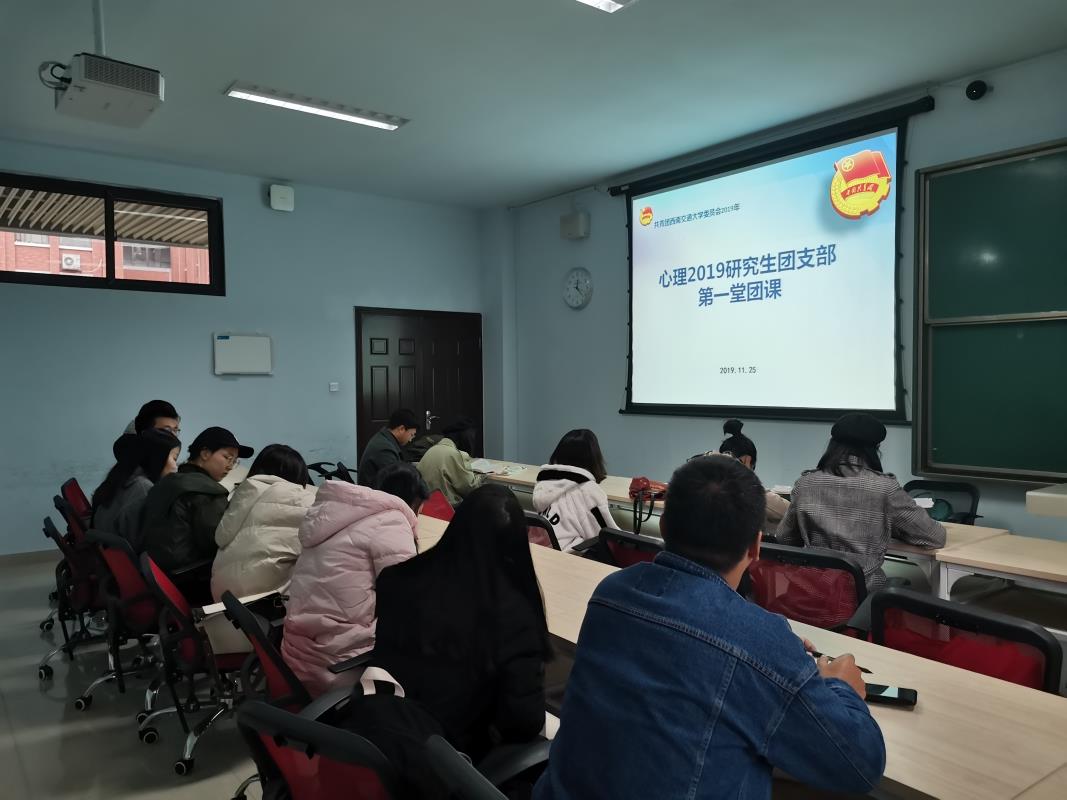 为帮助同学深刻理解共青团的意义和树立正确的价值观,11月25日下午,四川省午夜av 心理午夜av 2019级研究生团支部在X9237开展了第一堂团课活动,团课由支部书记陈瑶主讲。
