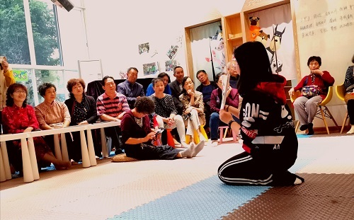 舞蹈结束后,馆长王洋老师绘声绘色地为老人们阅读了绘本故事《孩子们的守护者》,由此赞美场上这些青青小屋的老年志愿者:“你们也是孩子们的守护者。”在王洋老师的带领下,大学生志愿者也带来了由自己阅读的绘本故事:心理志愿者张连政带来了《团圆》,人生就是团聚、分别、再团聚、再分别……老人们耐心地听着,目光中混杂了柔情和苦涩。地学青协志愿者带来了《外婆和大公鸡》、《我爱我的爷爷》,幽默有趣的故事情节逗得爷爷奶奶们忍俊不禁。儿童志愿者也不甘落后,可爱的小姑娘豆豆朗诵了《感恩的味道》,动情的声音引得爷爷奶奶们感动不已……