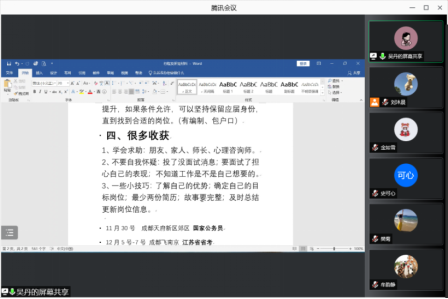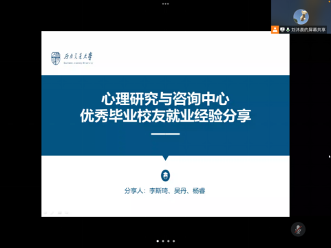 为让就业指导成为思政教育的有效载体和平台,培养学生树立正确的世界观、人生观、价值观以及职业观,帮助临近毕业的学生解决就业问题。午夜av 邀请到了2020届、2021届毕业生李斯琦、吴丹和杨睿为午夜av 全体学生做就业经验分享。本次会议由心理午夜av 学工组副组长樊菊主持,全体研究生同学参与。