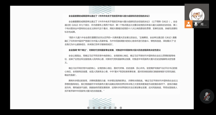 会上周仲仪同学带领大家深入了解学习了党的十九届六中全会精神。全体团员结合自身经历和实际思想,围绕学习内容进行了交流发言。