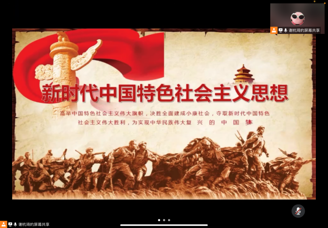 团支书先播放了一段视频,再介绍十九大报告提出了中国发展新的历史方位——中国特色社会主义进入了新时代。习近平总书记代表第十八届中央委员会向大会作了题为《决胜全面建成小康社会 夺取新时代中国特色社会主义伟大胜利》的报告,指出“中国特色社会主义进入了新时代”。