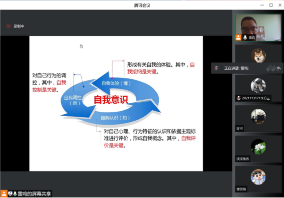 “外在健全人格,内在正心修身“,这是雷教授本次讲座的重中之重。他指出,我们识别出一个同学,靠的是他特有的行为模式。自我是人格的核心,雷教授在此基础上通过一张极为清晰简洁的导图,将自我认知、自我体验和自我调控的关系串联起来,构成了一个闭环,并就现实生活中大家对身形的看法及行动,从正反两个方面展示了积极的闭环能带给我们真实的提升和已形成固定模式的恶性循环对我们自身发展的阻碍。
