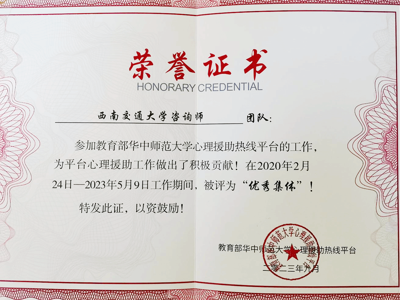 咨询师团队过去努力的肯定,也是对未来工作的激励。团队将继续秉承“服务需求、特色鲜明、追求卓越、示范引领”的发展理念,进一步加强专业建设,为师生提供更优质的心理服务,创新心理文化和心理健康教育模式,为构建和谐校园、推进社会心理健康事业贡献力量。