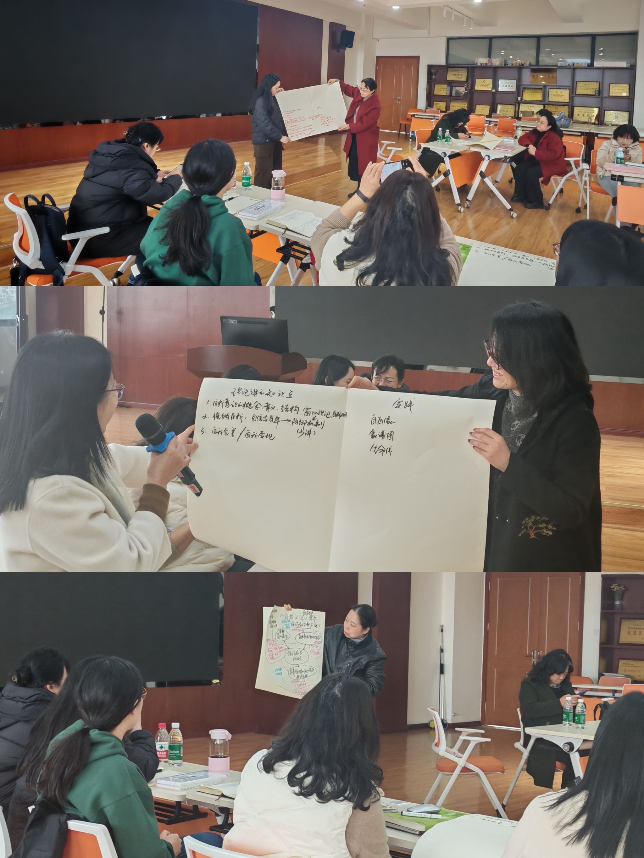接下来所有参会老师分为3组,结合课程内容安排、教学资源的选择、活动的设计等进行头脑风暴和讨论。赵轶群、高飞、唐静三位老师代表各自小组向所有参会教师进行展示分享。