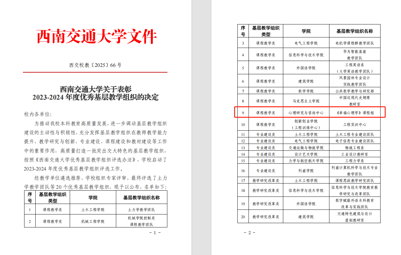 组织专家评审,最终评选出土力学教学团队等20个优秀基层教学组织。《幸福心理学》课程组获评优秀基层教学组织。