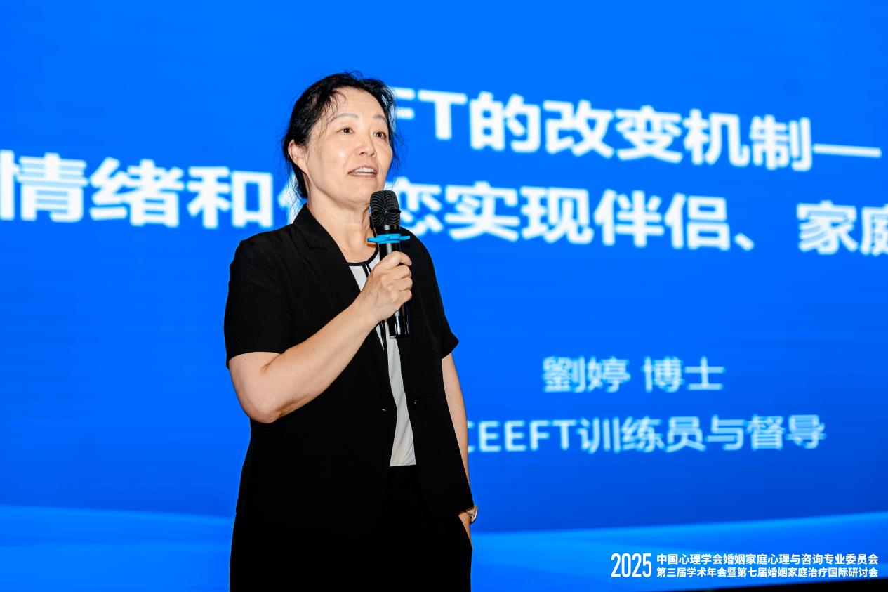与此同时,ICEEFT训练员与督导刘婷博士聚焦情绪聚焦治疗(EFT)的改变机制。作为以依恋理论为基础的整合性学派,EFT适用于个体、伴侣与家庭治疗。数据显示,经过10-12次晤谈,70%-75%的伴侣关系得到改善,且疗效在高压环境下仍能稳定维持两年;针对有童年创伤经历的伴侣,EFT能使 50% 的婚姻满意度提升,同时减轻创伤症状。刘婷强调“情绪是连接依恋的核心,EFT通过矫正性情绪经验,帮助个体与家庭重建情感联结。”。
