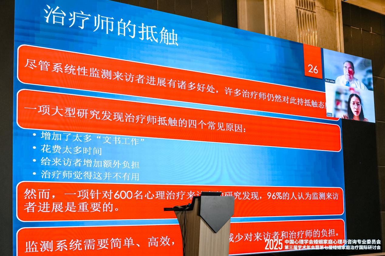 Richard B. Miller教授作为婚姻家庭国际研讨会倡导者和支持者,在此次大会上,从家庭治疗方面分享了自己的研究心得,实践导向研究:治疗师与研究者的协同共赢的报告,回顾了家庭治疗发展:自2012年首届中美婚姻家庭治疗国际研讨会后,家庭治疗在中国蓬勃发展,建议重视家庭治疗研究。提出了实践导向研究方法:介绍实践导向型研究,指出其与传统随机对照试验相辅相成,可通过系统性监测来访者进展提升治疗效果,数字技术使其更便捷;提出了研究网络:讲述实践研究网络,如美国杨百翰大学开发的基于家庭治疗实践的网络,治疗师或诊所可加入,且有中文版本;提出了基本比较法:提出用基本比较法评估家庭治疗有效性,相较随机对照实验更简便,通过实例说明操作步骤。